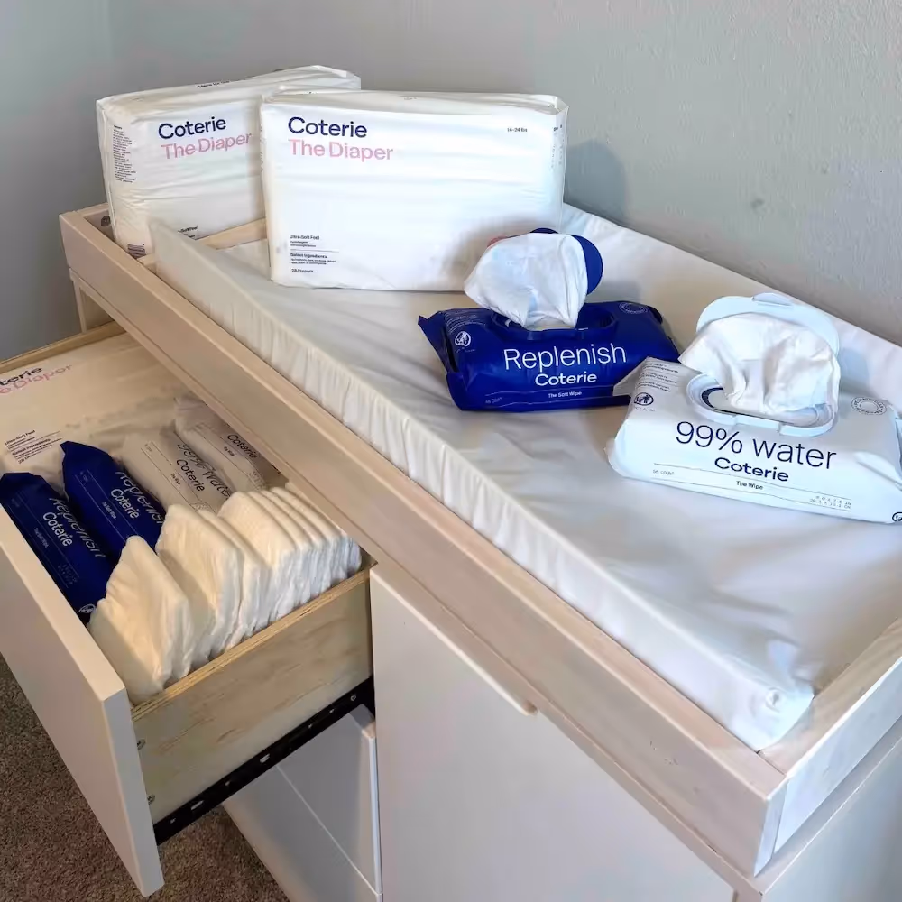 Coterie offers two options – The Wipe that’s 99% water, and the new Soft Wipe that’s infused with emollients and moisturizers (glycerin, dimethicone, glyceryl stearate, and cetyl palmitate) for extra-sensitive skin. Both help maintain a low skin pH, which protects against irritation and diaper rashes.