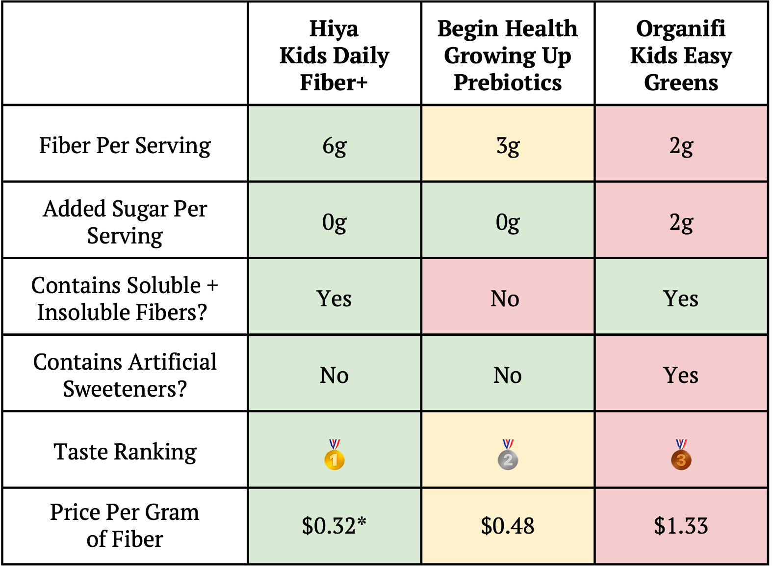 Organifi is the most expensive at $1.33/g fiber for a sugar-packed, low fiber supplement that our kids couldn’t finish.